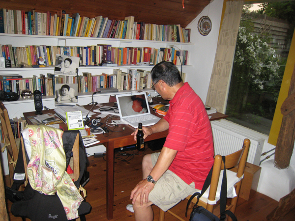 Recursion... I like this photo for a variety of strange reasons. The first is that my father is looking at Aldus on the computer when Aldus (the loud child) is about 3 feet behind him, off camera. I also like that my father has a beer. It is also interesting (to me) that you can see my baby picture in the background. The two photos of baby Yun's are from their representative eras-- the digital image from a digital camera on a spanky new Mac laptop and the black and white (!!) photograph printed and afixed to cardboard. |