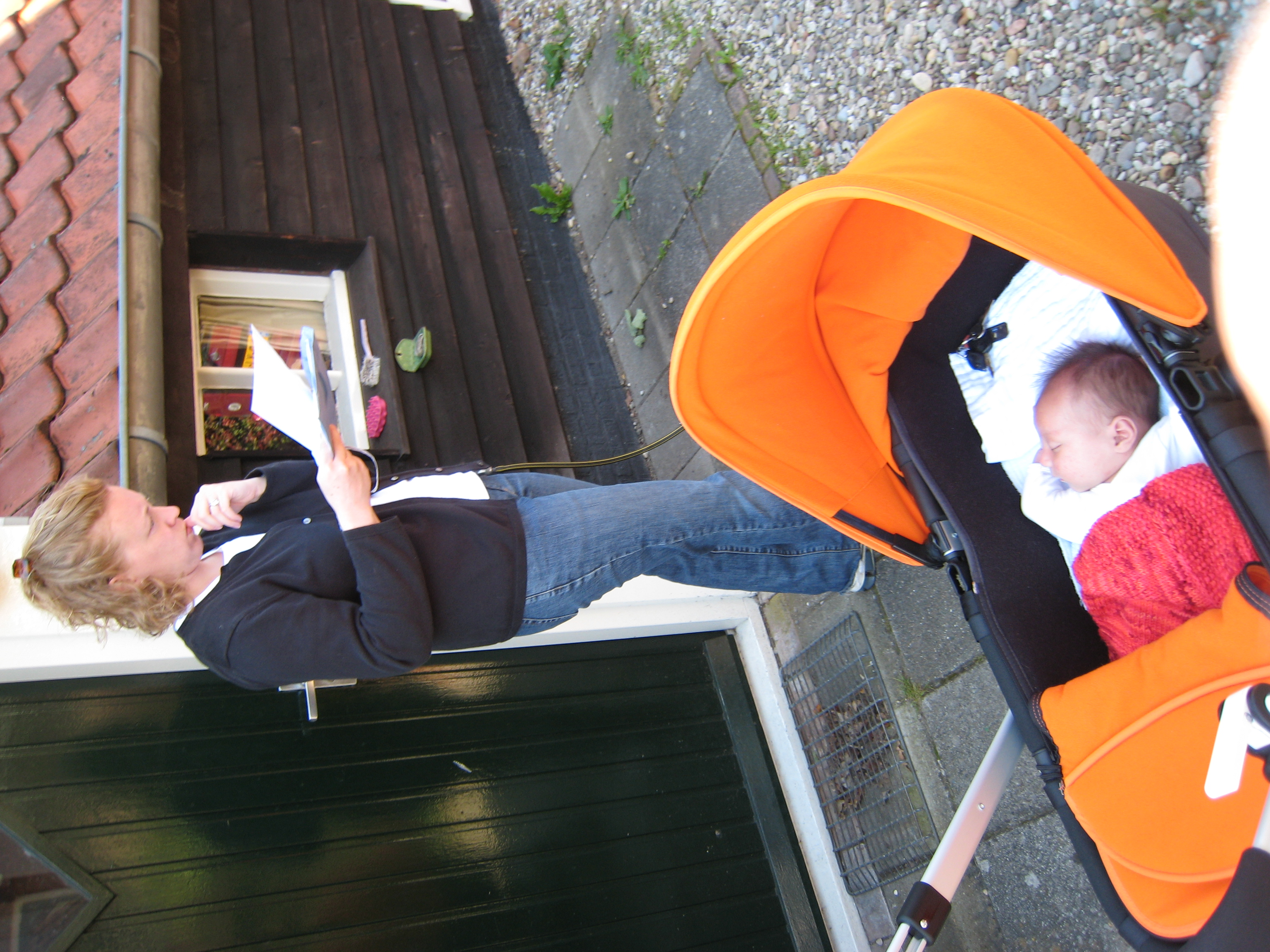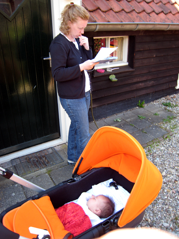 Heading out for a walk It is probably unsafe, but we keep our keys, burp clothes, wallet, camera, munitions, pens, and groceries in the stroller with Aldus. You can see keyes above Aldus's head. Under the orange flap we keep more stuff. And it occurs to me that we should probably put on the handle for the stroller's sleep basket. It seems like it is just for picking up the basket, but it might have a structural purpose. |