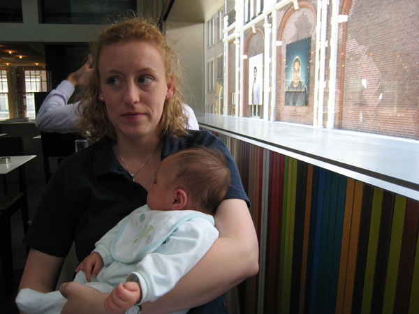 On the last day of my parents' visit, we met them in Amsterdam and went out to lunch. This was a pretty good restaurant just off the Spui. Or was it near the Dam? Anyway, I'll have to give you a rain check on the name. Aldus slept through most of lunch, then had to have a bite to eat of his own before we left. Not being one to like drawing attention to myself or, you know, show off my boobies in public, it's been kind of a fun adventure learning to breastfeed in public. The key has been to tell myself that the Dutch are much more accepting of this than Americans. I have no idea whether or not it's true. But if I tell myself that, then I can sit on a park bench or in a quiet restaurant and feed Aldus without worrying too much. Unfortunately, trying to find places where there aren't many people in this densely-populated country has also meant sitting in the car in a parking garage to feed Aldus on many occasions. I wish I had the cajones to really do it in public without worrying. -ksy |
