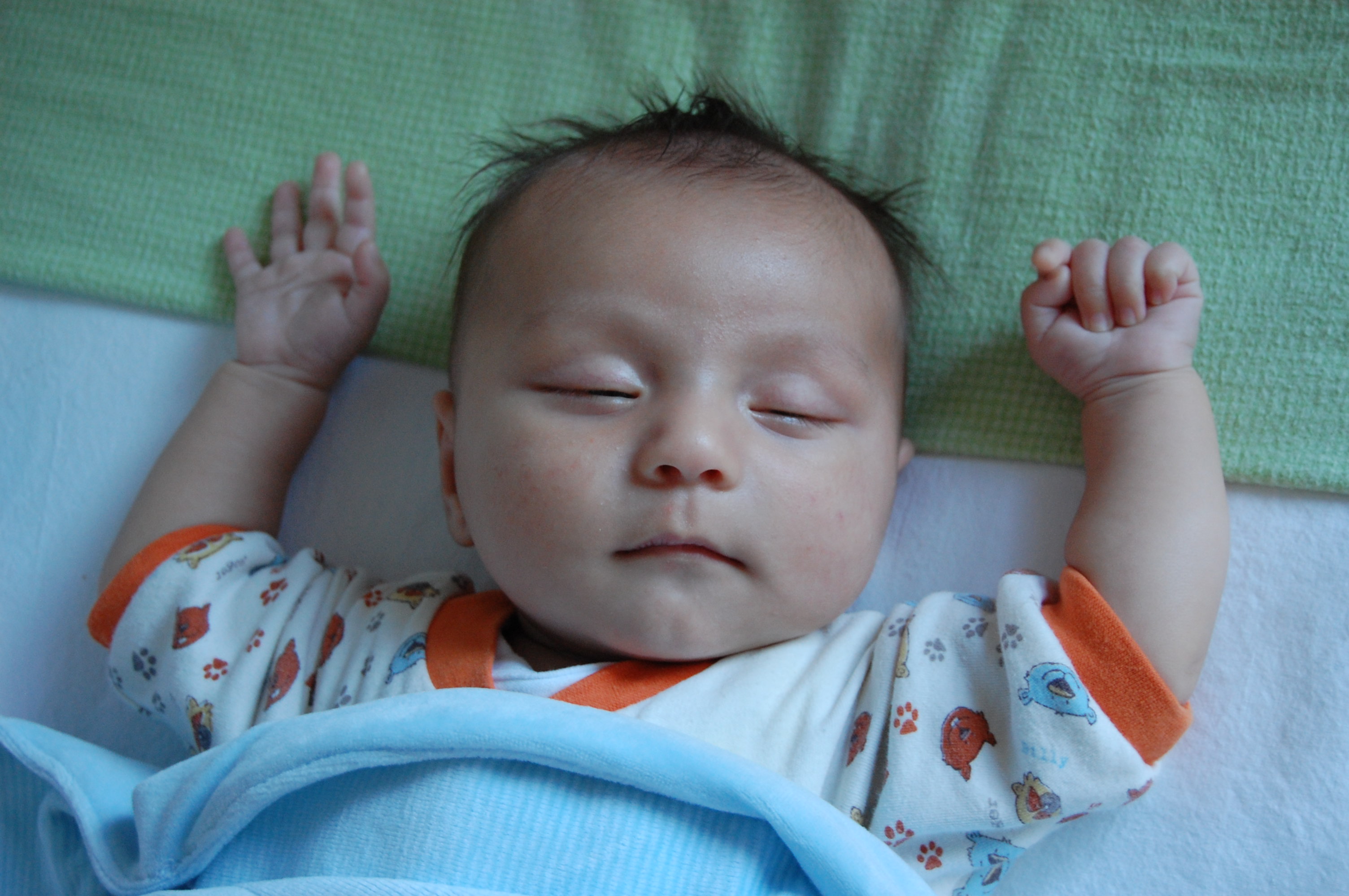 Have we pointed out how funny he looks when he is totally relaxed? If we have, instead focus on some of the other facial features that he has developed... Number 1: Square Head. I was fairly pleased that Aldus was born with an attractive looking cranium. Not to say that it is not attractive now, it is just more square. And sorta on the huge side. But that is understandable. Number 2: Dimple on chin. Yeah... Kristine does not have one. I do not have one... Maybe it is an excess of cheeks that is pushing the chin together? Number 3: You can't tell now, but the eyebrows move independently of one another. They are not prehensile, but Aldus has shown that he can raise one or the other independently. A very good early spock-like capability. Next, vulcan death grip... Number 4: Ears. He has Kristine's ear lobes. At least in the way that the bottoms attach to his head. Much more lobes than attached like mine. Number 5: My default "meh" frown. Compare my black and white baby photo that I keep around with this photo. The expressions are shockingly similar, even though he is asleep for this photo. Number 6: Eyes. Even closed, you can tell that he has both traits of Kristine and my eyes. You can see how the middle of his eyes are really big. And then the taper off very quickly at both sides like mine. The effect when his eyes are open is to exagerate the already infant-big size of his eyes. It is not scary/weird. In fact, several people (women) have said that it looks really nice. It will be interesting to see how he looks as he grows up. Nunber 7: No baby acne. An ongoing battle is his skin. It is much better than when he was a few weeks old. But it is still a bit "teenager, not clear, wanting product" messy. And that is really unsettling because a baby is supposed to have baby soft, baby clean, baby perfect skin. And Aldus doesn't. That said, the chicks still seem to dig him. Smelly diapers and all...